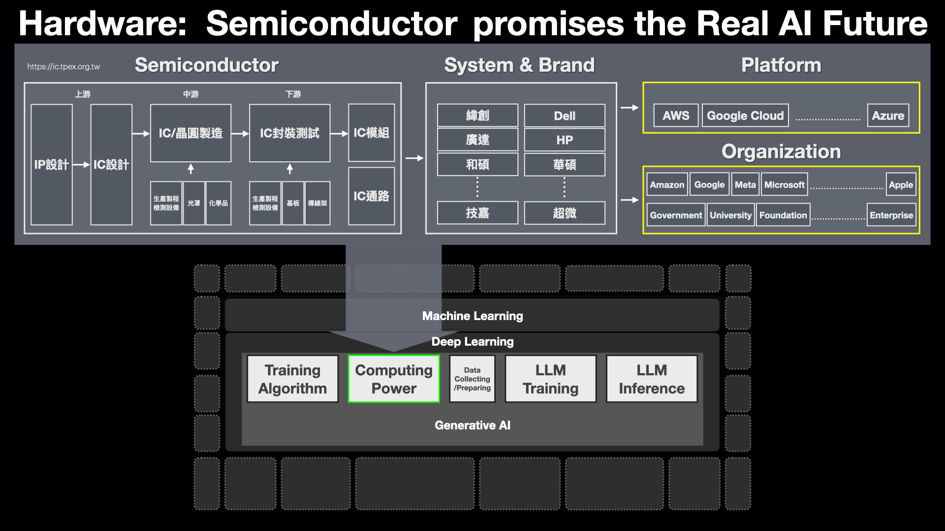 在泛 AI 產業的發展中,台灣(或說是台積電TMSC和其他伺服器系統相關業者)扮演著非常重要的角色,但最主要都是鎖定在「算力」(計算力與大量能力)上。從核心計算元件(CPU/GPU/TPU)、高速記憶體(HBM)至整套伺服設備的設計、製造...等,是當前 AI 產業發展中很重要的一部分。