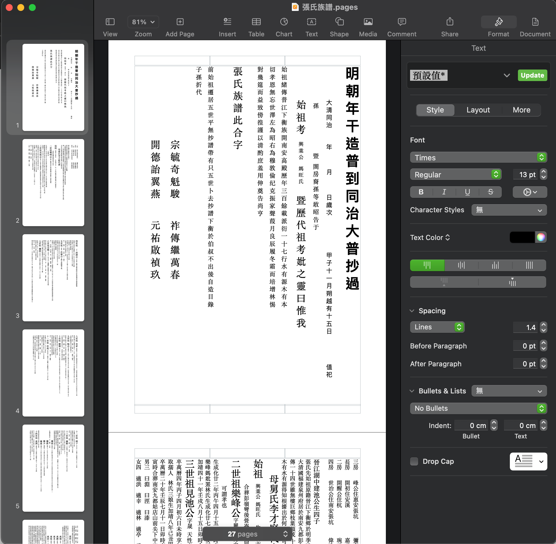 因為原族譜是採直式印刷的,且其排版與字體大小或有特殊意義、風格,並相對便於閱讀。於是我決定自己將整本族譜等同於「重新排版」一次,雖然有OCR後的文字,但錯誤不少,或是出現在檔案中的次序也會亂了(畢竟原圖是直式印刷),於是,我僅能對照原物來進行排版。種種技術的原因,我僅能選擇 Mac 的 Pages 來進行這件事。