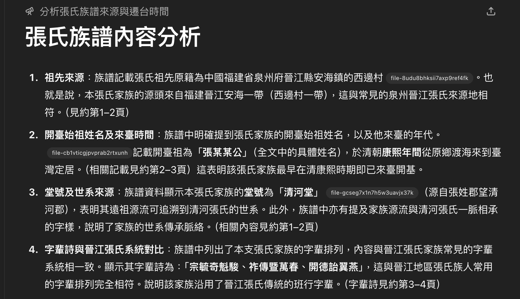 於是,我想到手中有一份我本家張姓的族譜,內容還不少,記載的時間橫跨明末、清至民國,近四百年的時區。當然因涉及數代人物也必然複雜。更令我好奇的是,族譜內文字的陳述與表達,包括200-300年前民間使用的文言文,甚至還沒有標點符號,這樣的舶來品AI模型可以解讀嗎?
