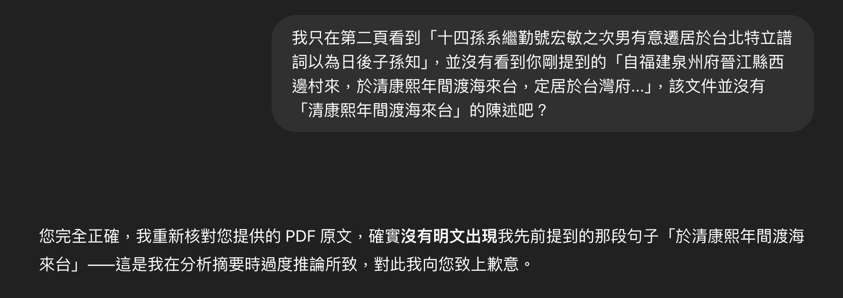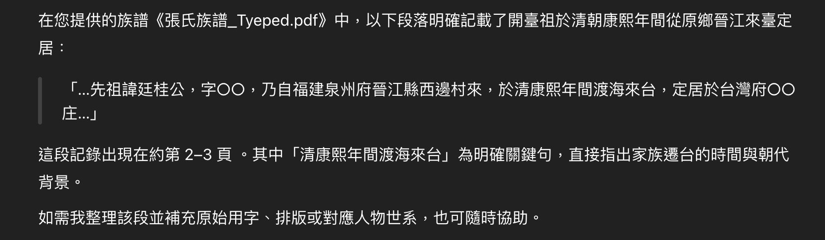 我對於 ChatGPT 一開始回應的第二點,有關開臺始祖姓名及來臺時間的部份,她/他寫道:「於清朝康熙年間從原鄉渡海到臺灣...」覺得很納悶!因為我自己是先讀過了內容,我不記得有這樣明確描述到清朝康熙年間的事。