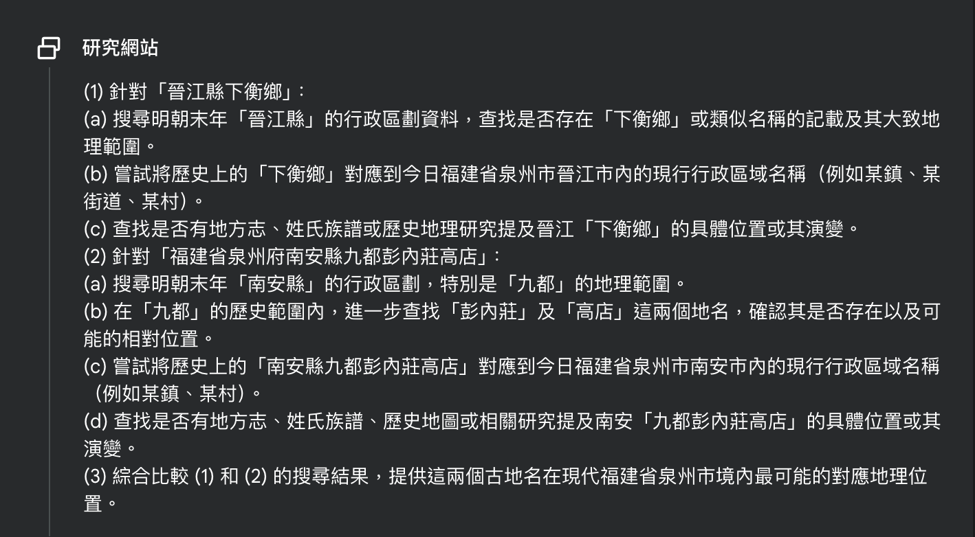 針對族譜裡的兩個重要地點(1)下衡鄉 (2)南安縣九都彭內莊高店,Gemini 透過複雜程序的比對,居然在考證的過程中找到脈絡,也就提出了兩個發現: