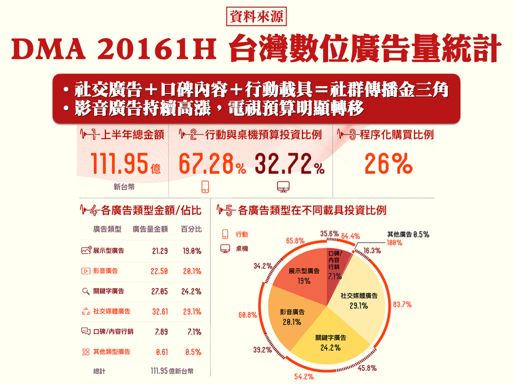 臺北市數位行銷經營協會(DMA)在2016年9月26日發佈了《2016年台灣數位廣告量上半年統計報告》(http://dma.org.tw/newsPost/82)。如同我在去年預估的,數位媒體廣告量終於正式超越了電視廣告量,代表著台灣的數位媒體不僅是接觸消費者的最佳與最主要管道,也顯現大多數廣告客戶已認知且接受數位媒體是行銷投資的重心。但是,從這份報告我們還可以看出什麼重要的意義和未來的趨勢? 嶄新的分類 在過去幾年,DMA發佈的數位廣告量調查報告有以下分類: (1)網站廣告(2)關鍵字廣告(3)影音廣告(4)行動廣告(5)社群口碑行銷 其中社群口碑行銷是2012年才出現的新類別。但是2016年的分類方式改成了: (1)顯示型廣告(2)影音廣告(3)關鍵字廣告(4)社交媒體廣告(5)口碑/內容行銷(6)其他類型廣告 顯見行動廣告的重要性已經超過桌機(PC),不再需要獨立凸顯手機的佔比;新出現的社交媒體廣告別顯示例如Facebook上的廣告已快速取得在預算分配的重要性;原本的社群口碑行銷類改為口碑/內容行銷類,