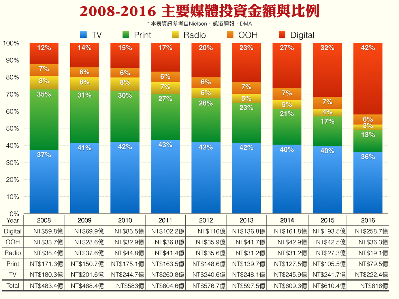 台北市數位行銷經營協會(DMA)於2016年4月26日公布了《2016年全年度台灣數位廣告量》統計報告,揭露了2016年台灣數位媒體的廣告投資總額為新台幣258億元,相較於2015年的193億元,達33.69%大幅成長(詳情請見DM官網 http://www.dma.org.tw/)。從這份最新出爐的報告中,我們可以看到什麼發展趨勢?行銷人可以有何態度與準備面對將繼續變化的媒體環境? 數字是趨勢的信號 過去各單位的各媒體年度投放數字統計必然有其方法、根據和假設。我們看待這類的數字可以不拘泥於數字絕對值,或許可以比較不同媒體/類別的彼此增長差異,辨識數字背後隱含的趨勢信號。例如,2016年起數位媒體投資開始超過電視媒體,這就是一個趨勢信號。以下的內容即依此原則,蒐集、比對過去幾年DMA曾發表的數字,包含DMA曾引用來自尼爾森的其他媒體投放數字,嘗試以較大時間尺度觀點,檢視產業的變動。(本文圖表或許與引用原單位最終發表數字不同,純粹是個人為研究市場所製,並不代表任何單位。) 8年來動能來自數位 如圖一所示,過去8年來(2008~2016)五大主要媒體的消長浮動很大。整體看來紙媒
